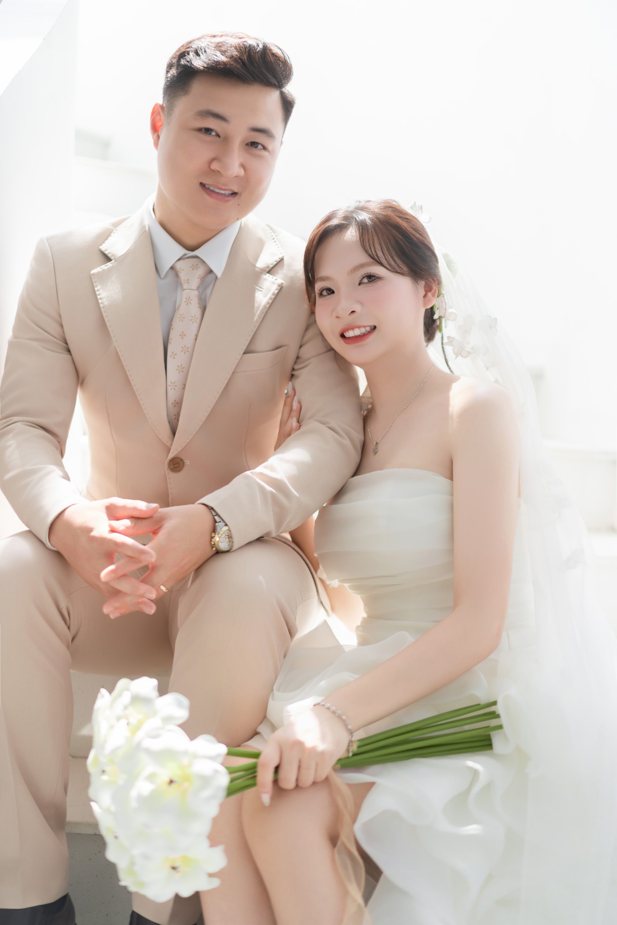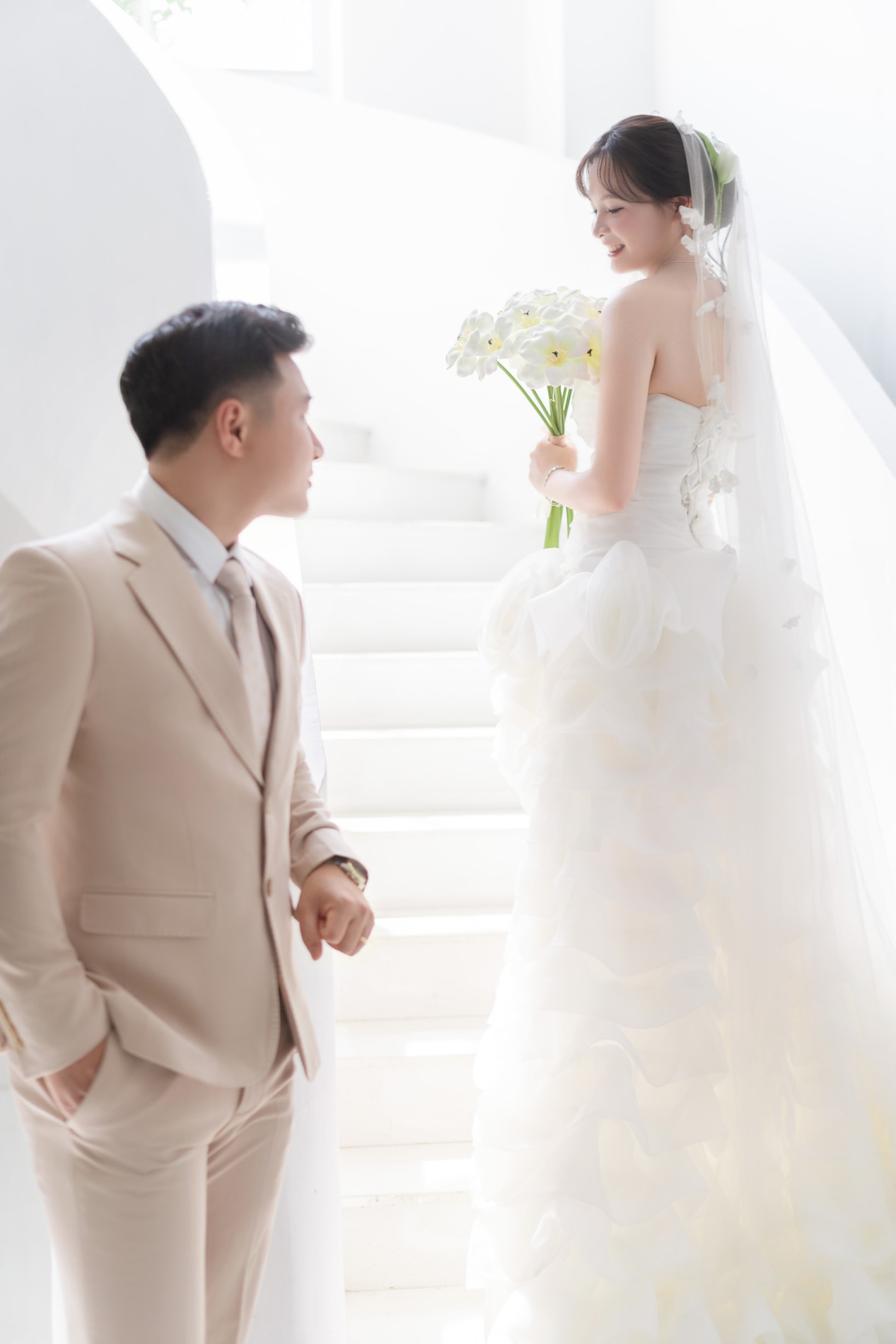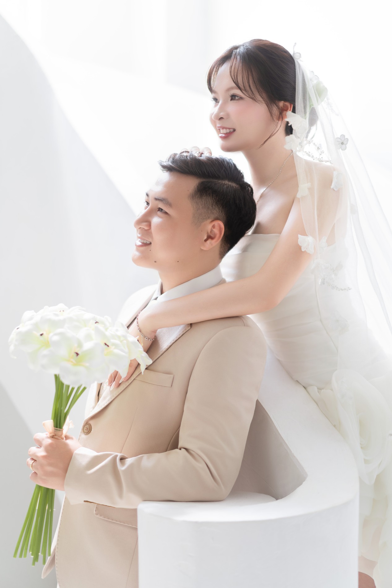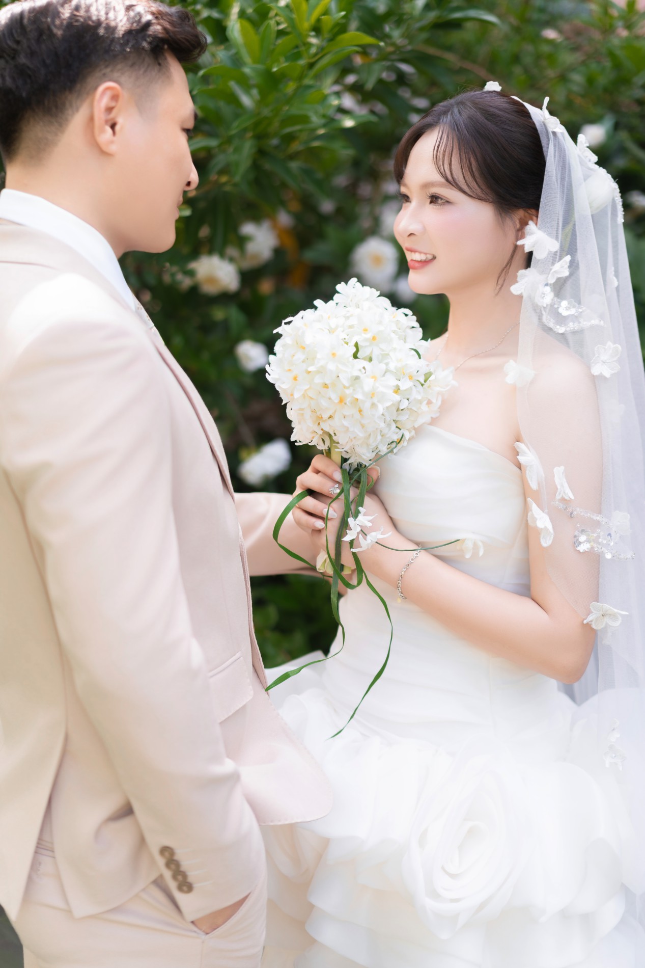 Chú rể rất đẹp trai, nụ cười của chú rể như ánh nắng, sưởi ấm, làm cô dâu đắm say, chú rể luôn tinh tế, quan tâm cô dâu, luôn tạo bất ngờ khiến cô dâu thấy rất hạnh phúc. Luôn ở bên và là bờ vai vững chắc cho cô dâu.